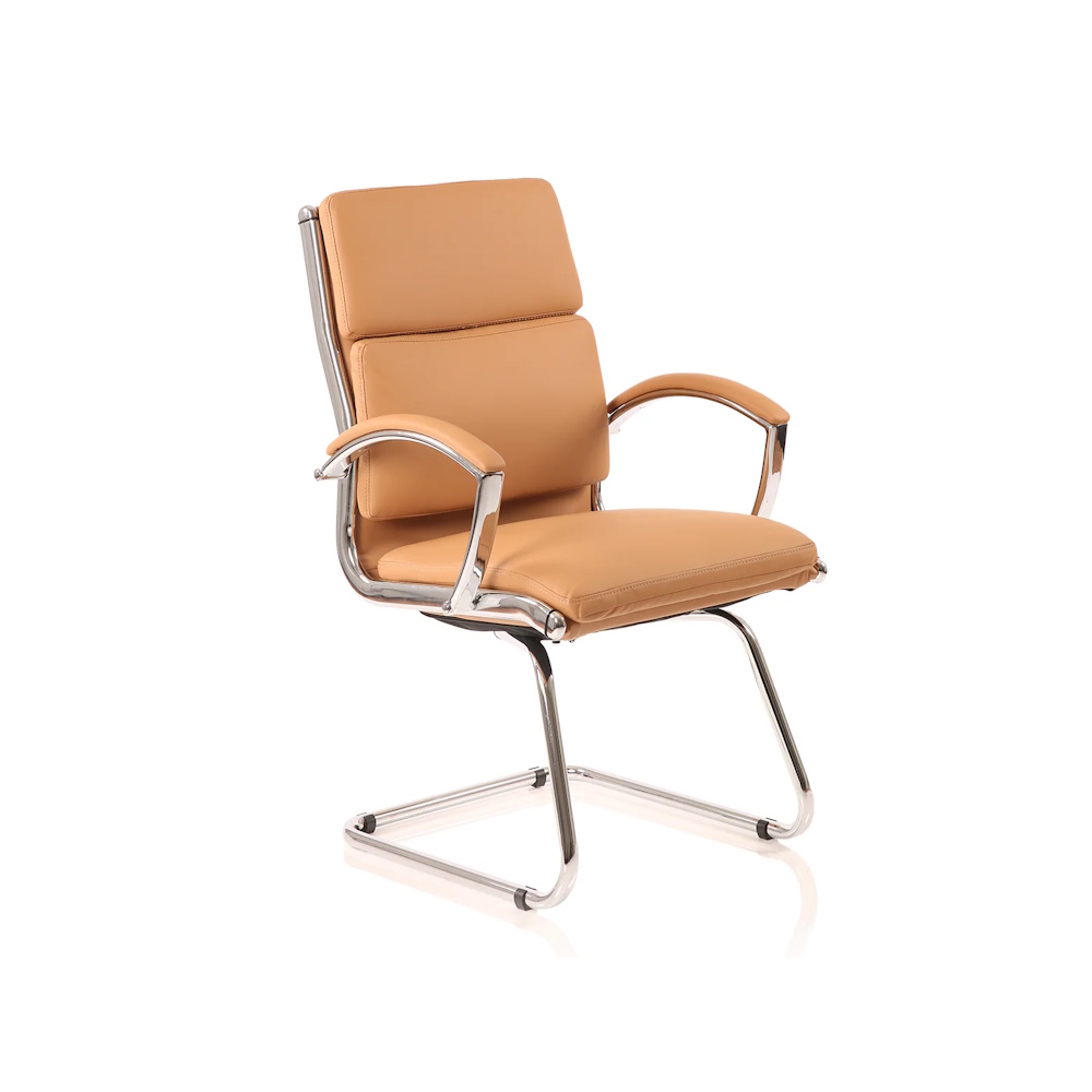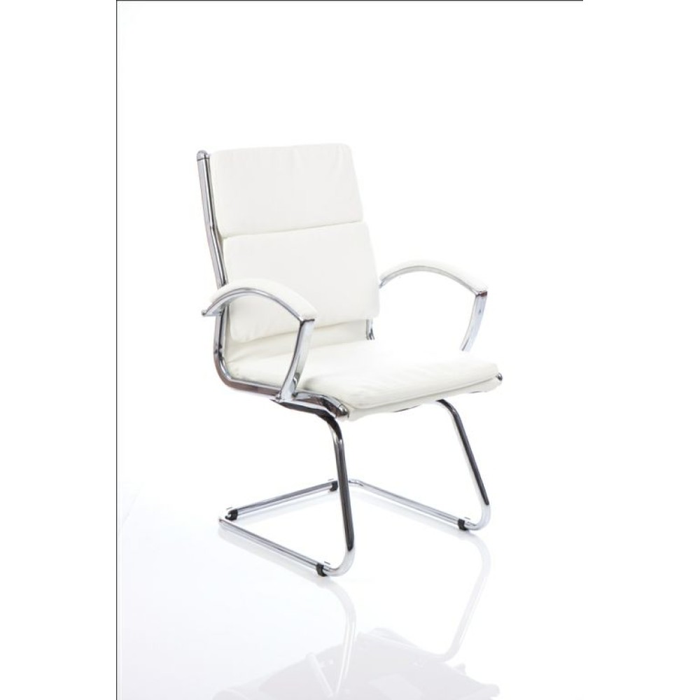 Upgrade your office in style with this contemporary Classic range of seats. Comfort and style are masterfully paired through this versatile range of choices: high and medium back versions and a visitor option are all available in either black, tan or white bonded leather upholstery. The generous seating proportions are deeply padded to provide day long comfort. There are appealing chrome details throughout, including the padded, upholstered arms. Bring some class to your office with the Classic