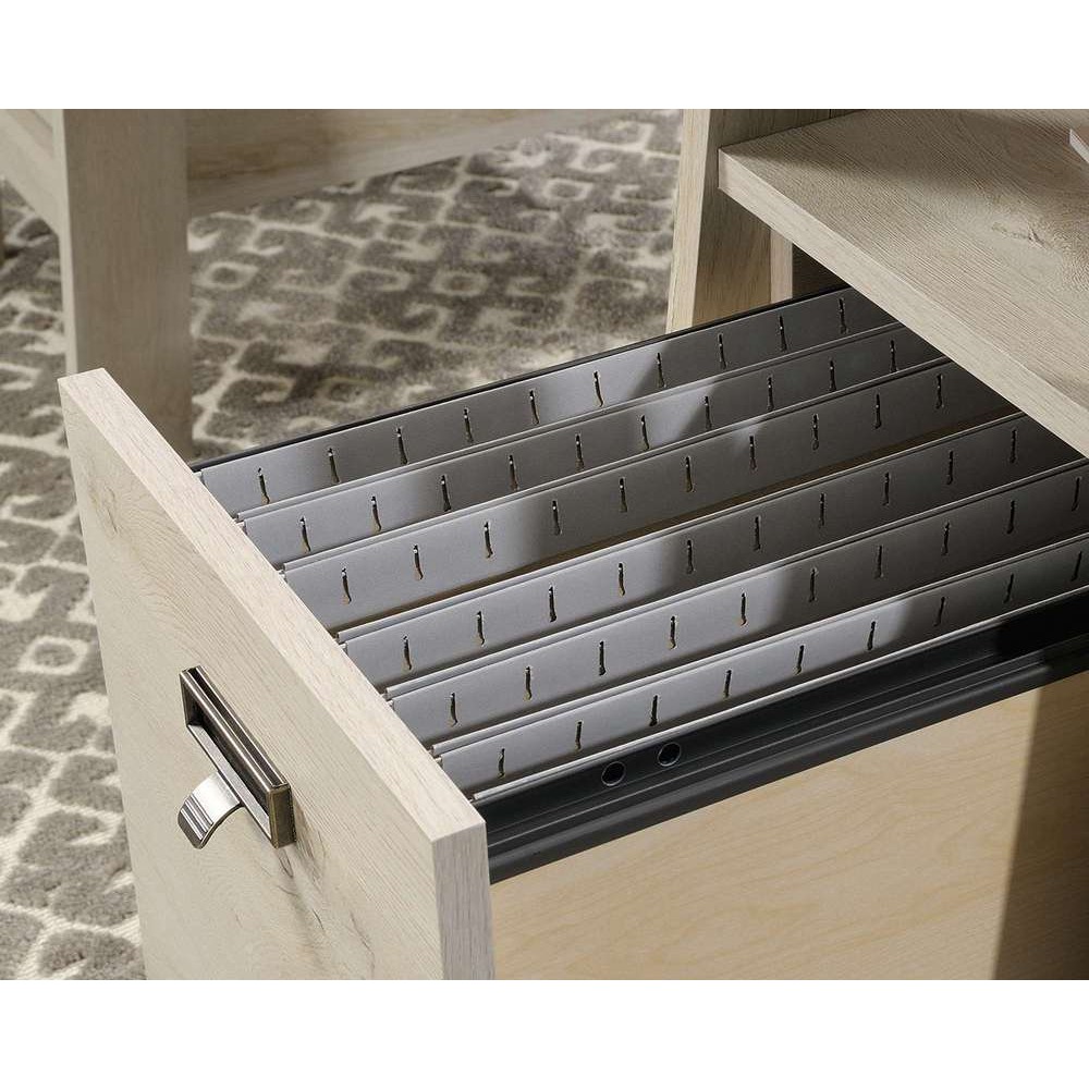 - Two filing drawers with full extension slides for letter-sized hanging files