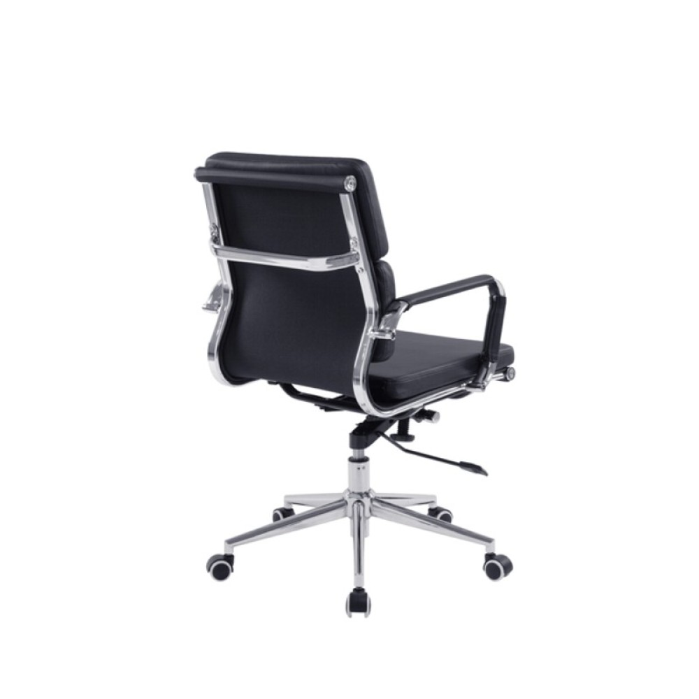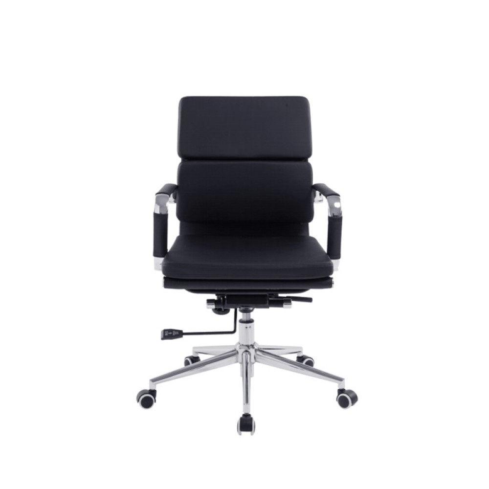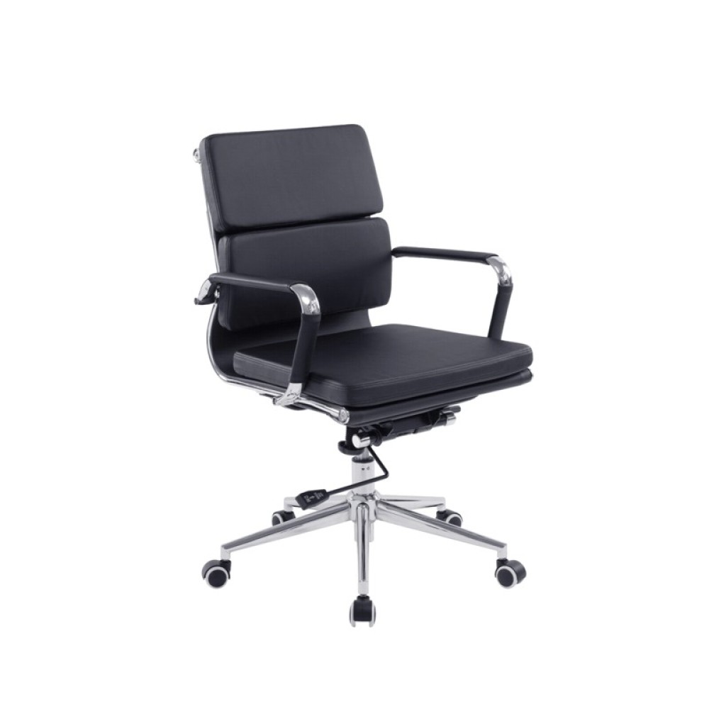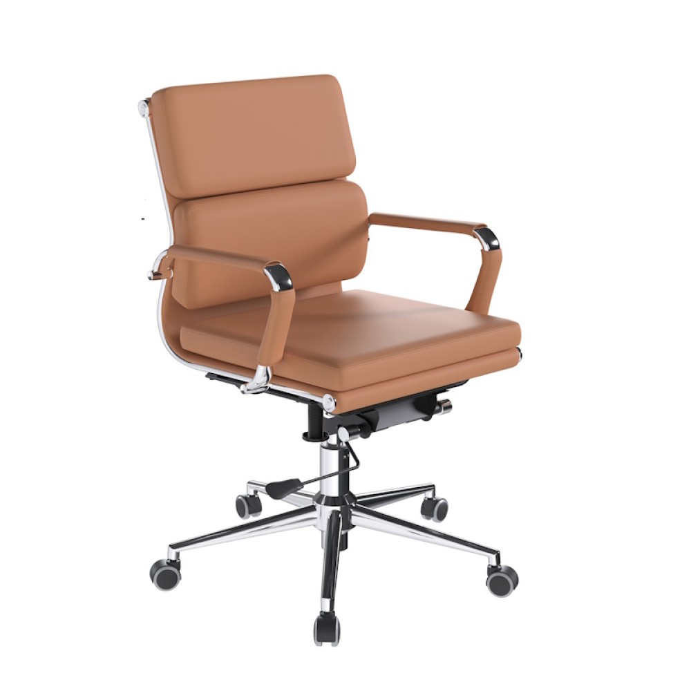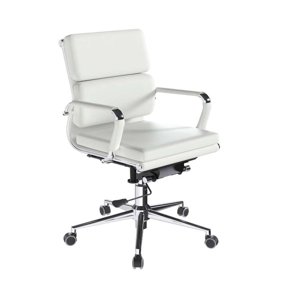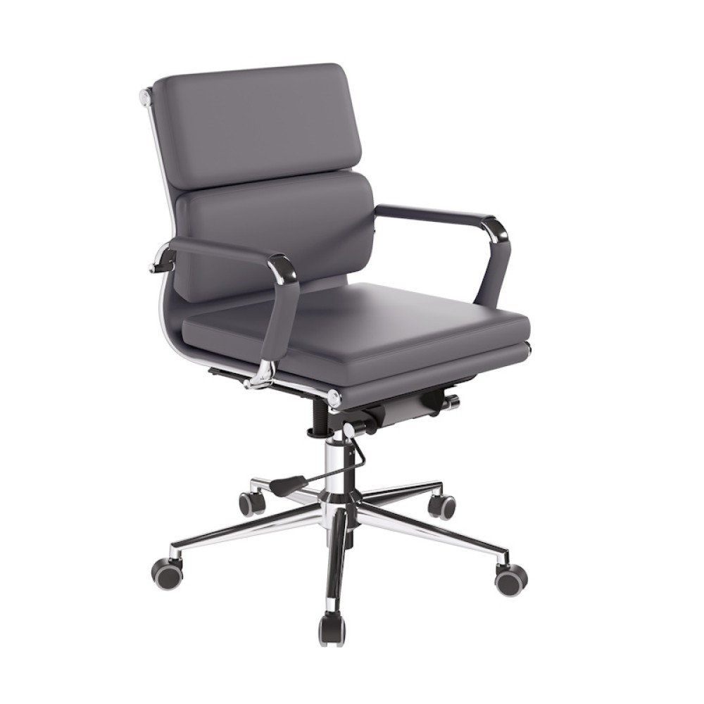 This mid back designer executive chair is upholstered in plush bonded leather and is suitable for both a workplace or home office environment. Offering detailed stitching with a bold triple panel back cushion design, a strong single piece chrome frame with complementing integral chrome arms with bonded leather sleeves, it has a gaslift for easy seat height adjustment, and a mechanism which allows the user to fully recline in the chair and is adjustable for individual bodyweight (tension control) which can be locked in the upright position. It is finished with a polished chrome spider base with twin wheel hooded castors